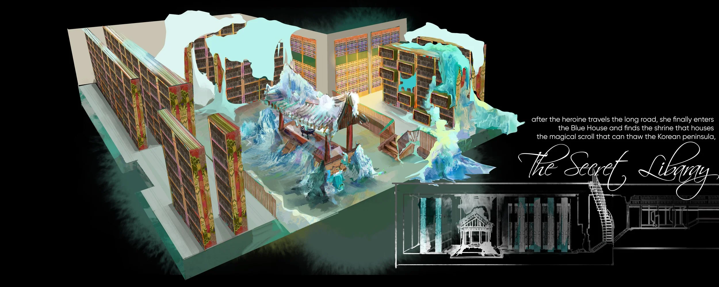 the library is housed in the blue house of korea (where the presidents used to live until recently), containing all the secret and known knowledge about the human life in korea and the traditional magic known to certain lineages in korea. it is historical monument that people built a while ago. the historical architecture standing amongst the masses of blocks assume that very few traditional architecture survived.