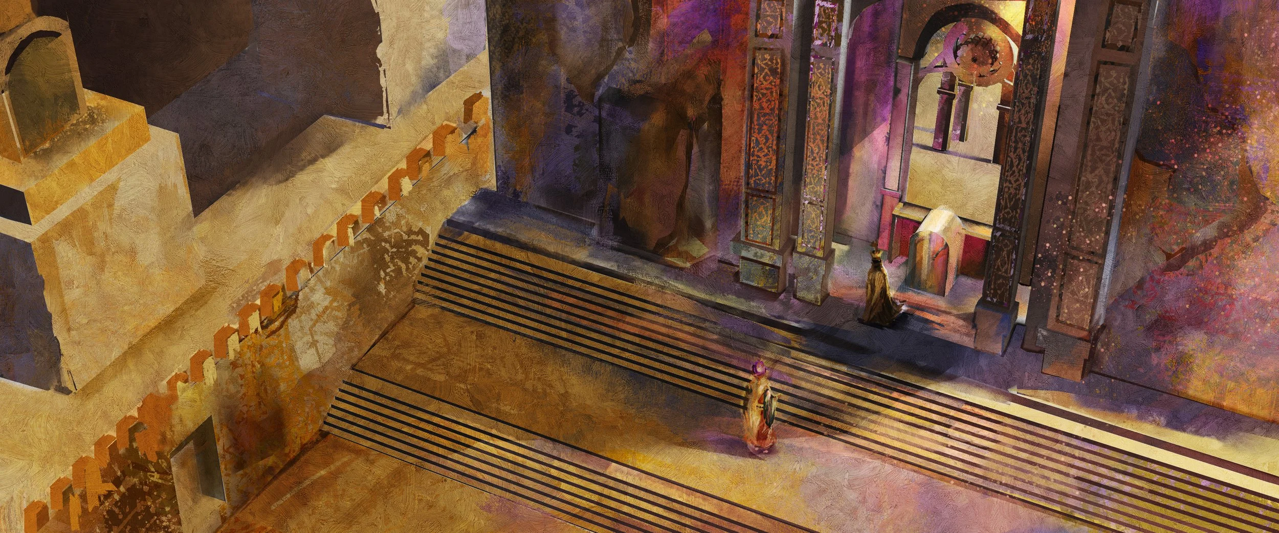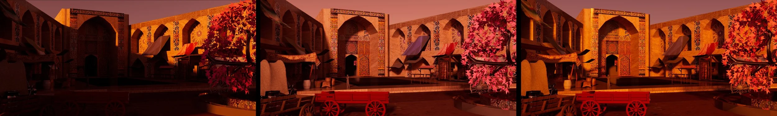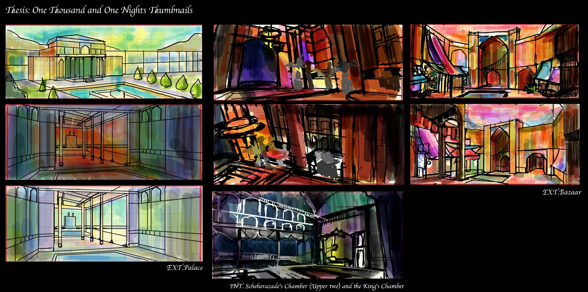 one thousand and one nights is an anthology of middle eastern tales more commonly known as the arabian nights. I am interested in portraying a fairy tale that appears happy at first glance, but is in reality unfortunate. The audience will be taken into a dynamic journey that spans across multiple tales with the royal blue colour of the king’s chamber seeping through her warm, fictional world.