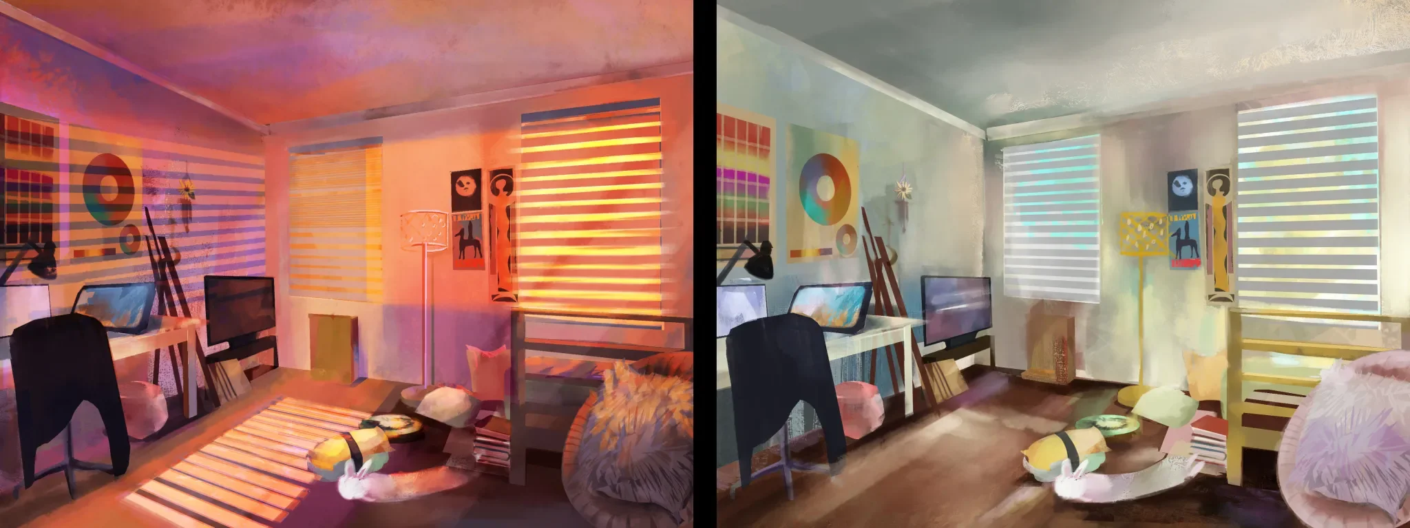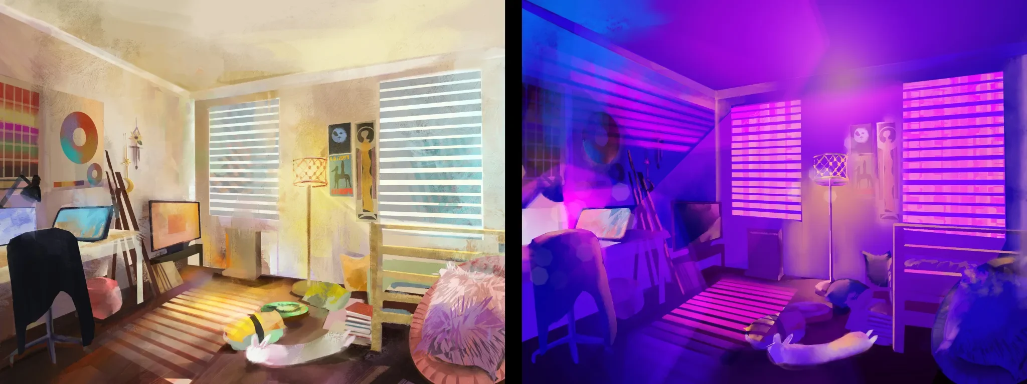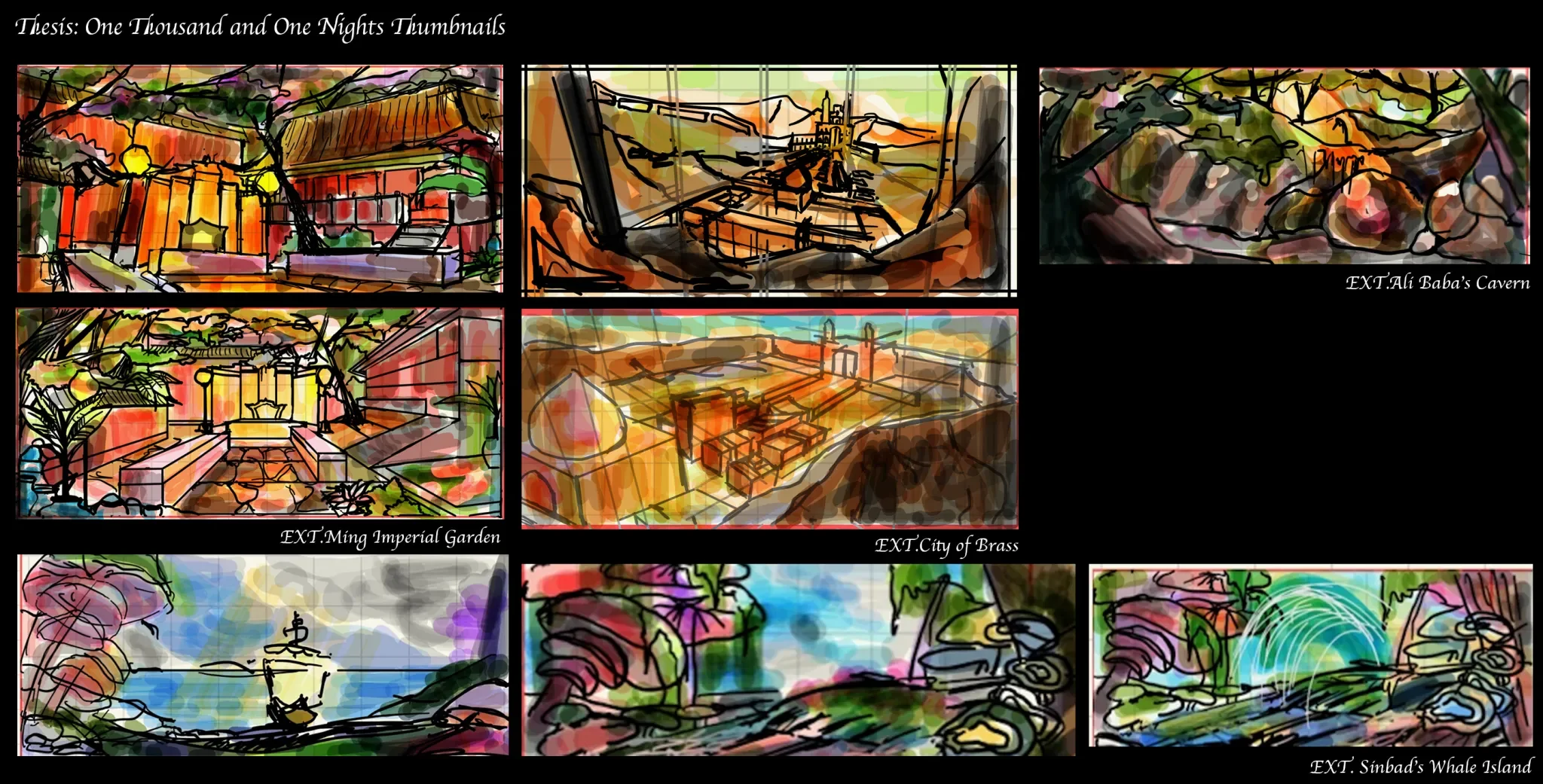 one thousand and one nights is an anthology of middle eastern tales more commonly known as the arabian nights. I am interested in portraying a fairy tale that appears happy at first glance, but is in reality unfortunate. The audience will be taken into a dynamic journey that spans across multiple tales with the royal blue colour of the king’s chamber seeping through her warm, fictional world.