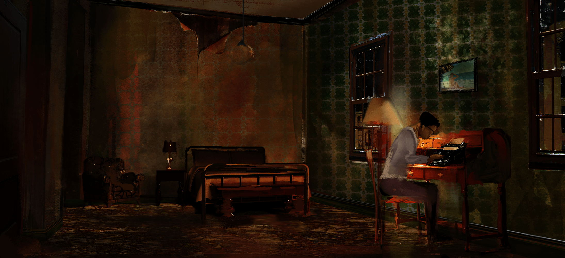 when we are stuck in a creative block, there are no walls or definition that provides a glimpse of a hint into what may become a storyline; there is only nothingness. My challenge is to create a space that is true to the period while accentuating that suffocating nature of an emptiness that seems to point to no visible way out.